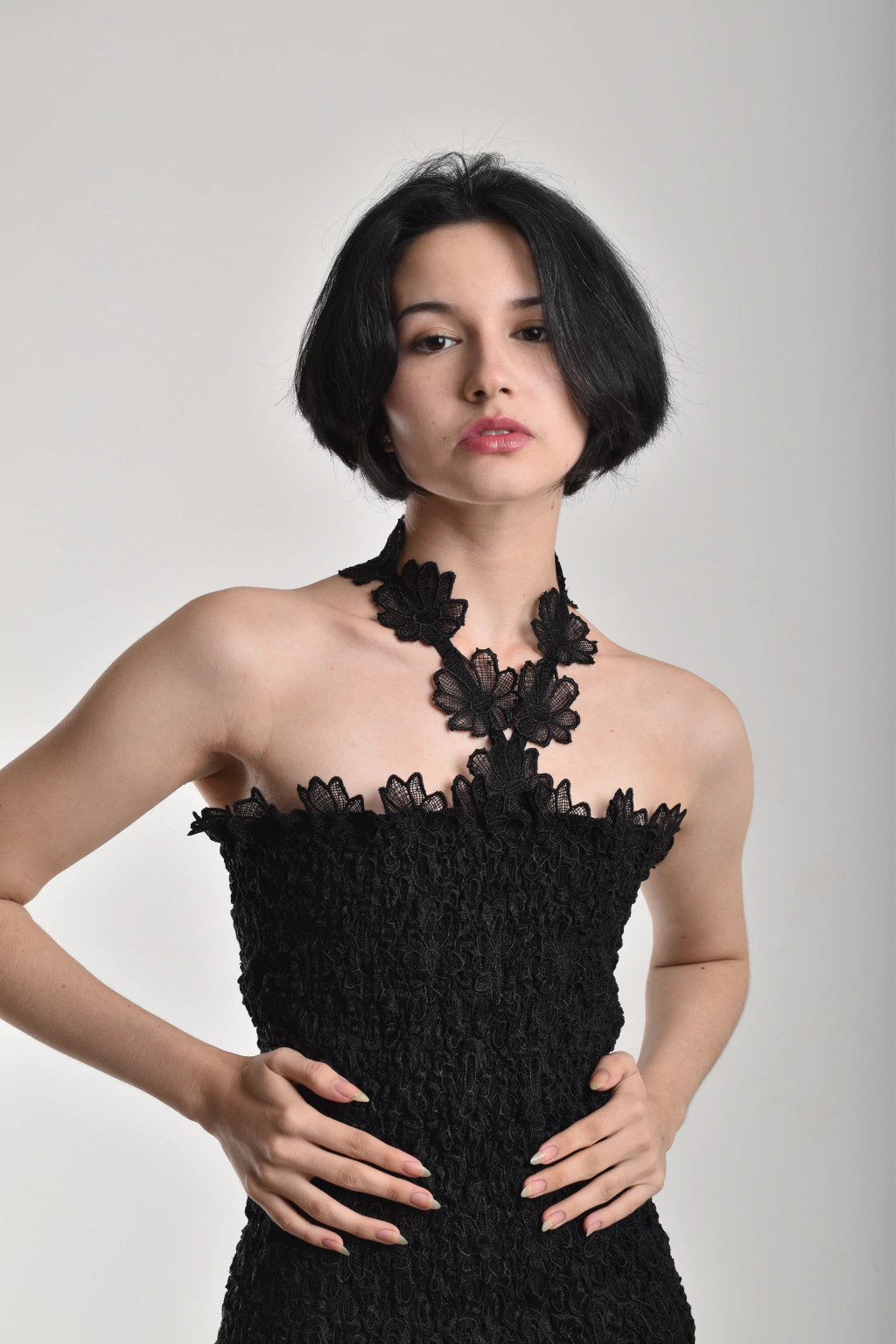 ODETTE mini dress, hecho para realzar la silueta femenina. Este vestido cuenta con un resorte que llega hasta la mitad de la cadera, permitiendo un ajuste perfecto y adaptable al cuerpo,
